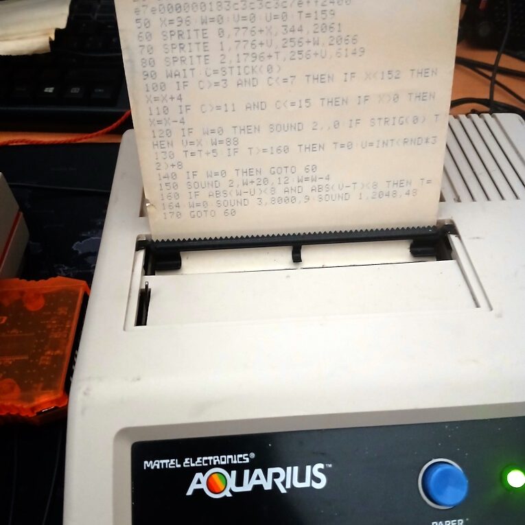 I got a Mattel Aquarius along the printer a few days later. I had to clean it because it was pretty dusty. The printer doesn’t have the top cover that protected the paper roll, but it included a paper roll, and fortunately it still had the cylinder that helps the papel to roll.