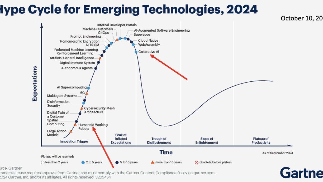 Recently a new generation has stumbled upon the idea of building humanoid robots and you may have noticed just a little bit of hype about it. Gartner says it is early days and we are nowhere near maximum hype yet. This diagram is just a year old, and humanoids are at the very beginning of the cycle, while generative AI is over the hump and heading down to the doldrums: